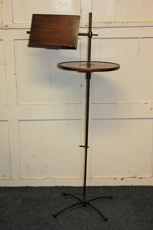 A late Victorian 'Carter's Literary Machine' music / reading stand comprising an adjustable rest and circular platform, with adjustable brass mounted iron pedestal on four outswept legs, maker's plaque, 130cm