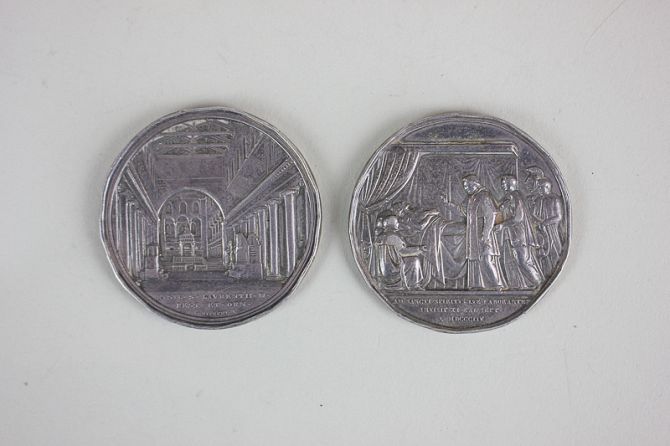 Two Papal medallions, Pope Pius IX (1846-1878), one engraved with the Stanze of Raphael in the Apostolic Vatican Palace, by Giuseppe Bianchi, the other depicting Visit of the Pope, to the Ospedale di Santo Spirito in Rome, dated 1854