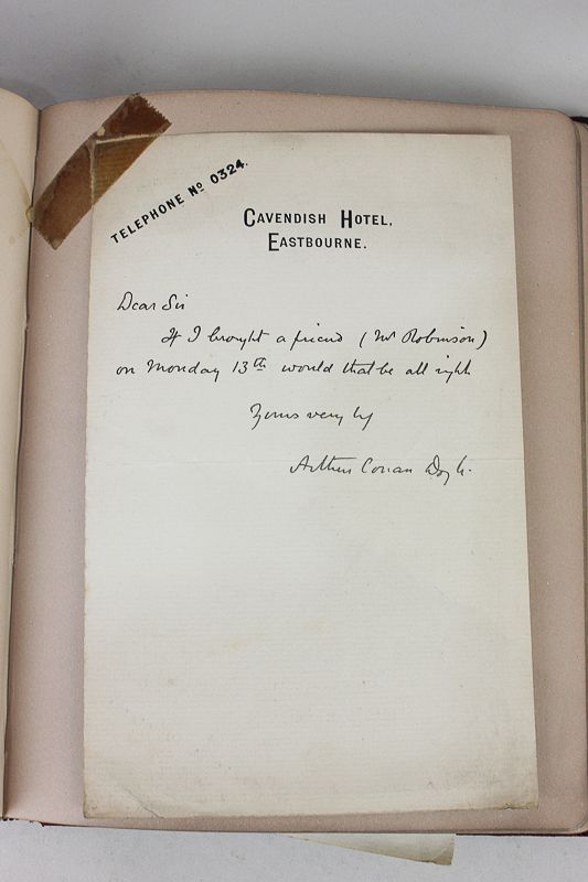Arthur Conan Doyle, a signed note regarding bringing a friend to a meeting, on Cavendish Hotel, Eastbourne, paper, within an album of signatures and letters, late 19th / early 20th century, including Anton Lang (actor) and Gustav Roos Esq, founder of Hendon Rifle Club, provenance by descent