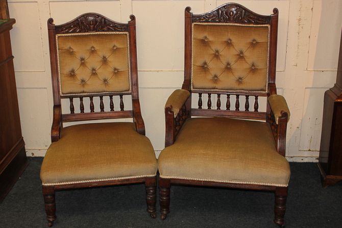 A pair of Victorian fireside king and queen chairs with foliate and shield carved surmount and button upholstered back, on spindle supports, with padded seat on turned legs and castors