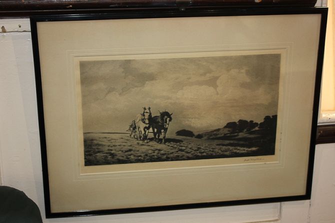 Joseph Kirkpatrick, figure working a field with two horses, 'Ploughing', monochrome aquatint, signed in pencil, inscribed paper label for W.R. Deighton & Sons, 24.5cm 41cm