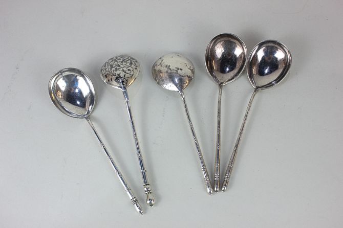 A pair of Russian 84 Zolotniks silver and niello serving spoons with foliate decorated bowl backs, and three similar unmarked spoons with pear shaped bowls and engraved initials