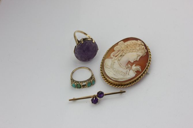 A carved amethyst dress ring in 9ct gold, a turquoise ring (a/f), a shell cameo brooch, and an amethyst two-stone bar brooch