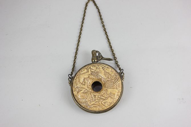 A brass mounted gunpowder flask with embossed design of nude female figures