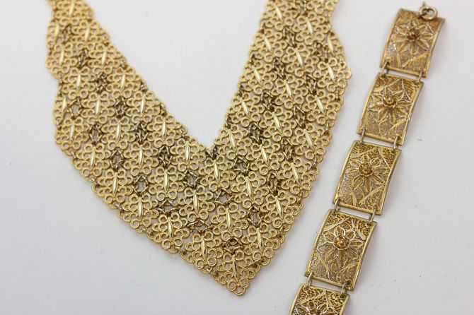 A gilt necklace strung with graduated pierced quatrefoils, and a filigree gilt bracelet