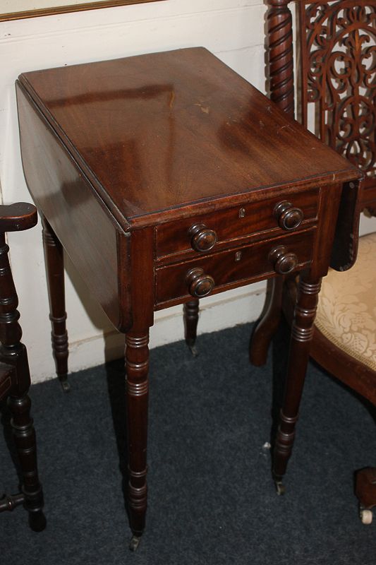 A Victorian mahogany Pembroke work table with two drawers, on turned legs and castors, 49cm