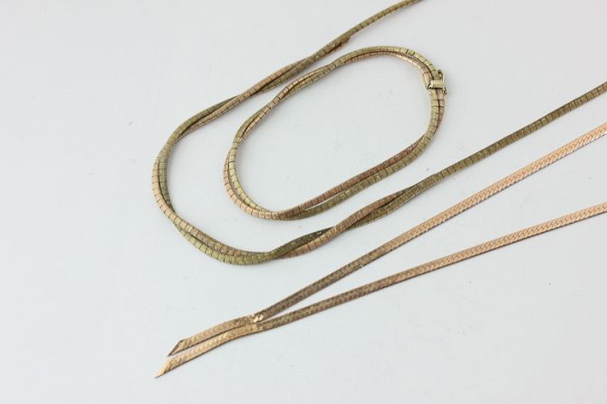 A 9ct two-colour gold necklace and matching bracelet, a 9ct gold neck chain, 37.5g, and two coins
