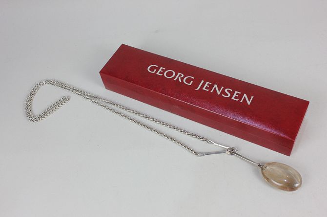 A Georg Jensen Danish silver rutilated quartz pendant, number 131, designed by Vivianna Torun, on number 297B silver neckchain, in original box
