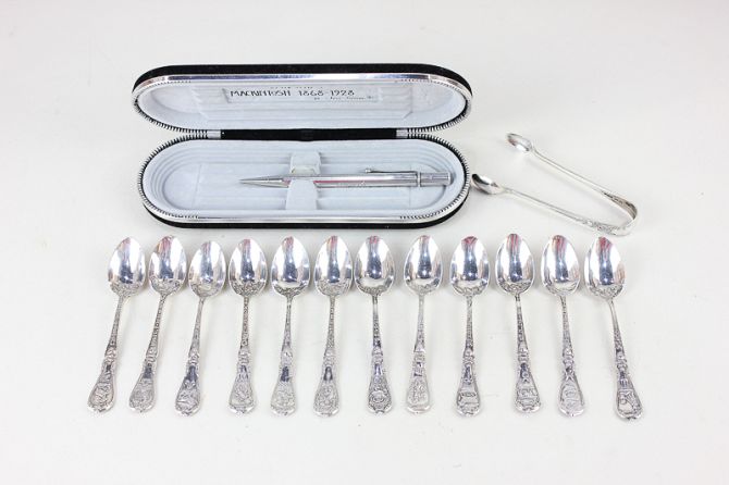 A set of twelve George V silver signs of the zodiac coffee spoons, hallmarked Birmingham 1922, a pair of silver sugar tongs, and a mid-20th century silver propelling pencil