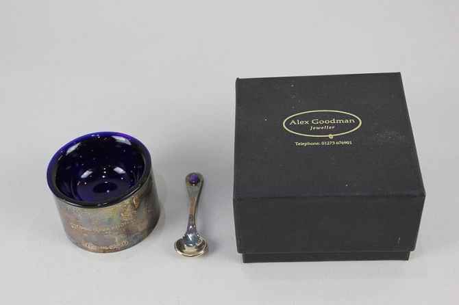 An Elizabeth II silver salt with blue glass liner and matching spoon, maker AHG (possibly Alex Goodman) Sheffield, 1999, to commemorate Historic Sussex Hotels, boxed