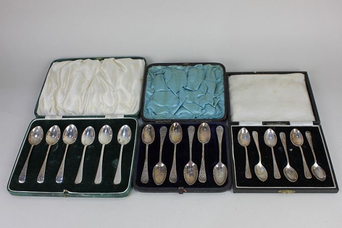 A cased set of six Victorian silver coffee spoons, with shell and scroll decorated handles, London 1881, a cased set of six George V silver coffee spoons, and a cased set of six Mappin & Webb plated teaspoons