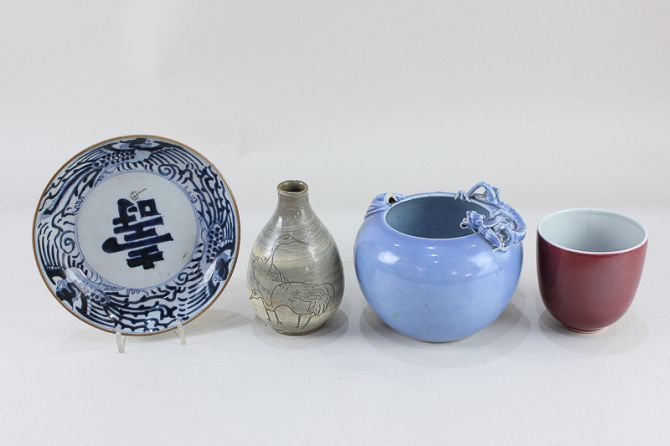 A Chinese porcelain blue glazed porcelain vase, of concave bowl shaped form, decorated with a sinuous dragon applied to the shoulders, mark to base, 11.5cm high, a Chinese blue and white porcelain dish, decorated with a character symbol within a border of birds, 'double-fish' mark to base, 15.2cm diameter, a small brown Chinese vase, with incised decoration of birds, character marks and stamp to base, 12.5cm, and a porcelain cup with 'sang de boeuf' deep red glaze, 8.5cm high (all a/f) (4)