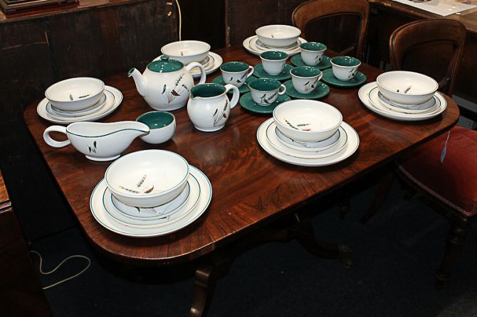 A Denby Greenwheat pattern part dinner and tea service, comprising teapot, milk jug, sugar bowl, six teacups, saucers and tea plates, six dinner and dessert plates, six bowls, and a gravy boat