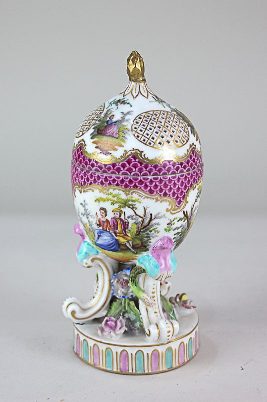 A Potschappel, German porcelain potpourri egg shaped jar and cover, decorated with scenes of lovers, on scroll supports with bocage floral embellishment (a/f) 18cm high