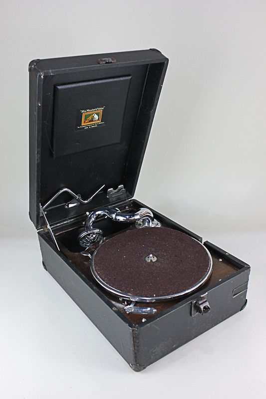 A "His Masters Voice" HMV portable gramophone, with winder (a/f) in case, 29cm by 42cm