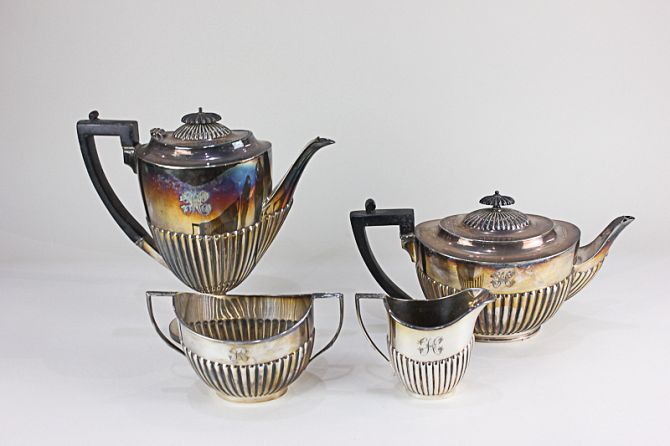 A Benetfink & Co silver plated four piece teaset of half reeded form, monogrammed