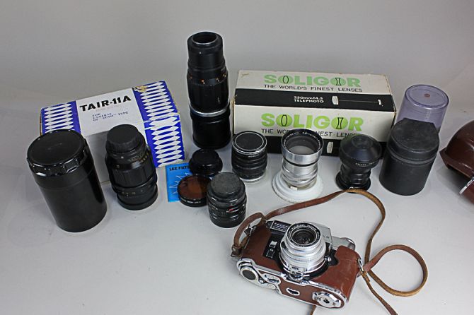 A Soligor telephoto camera lens, a Tair - 11A lens 2.8/135, four other camera lenses, and a Kodak Retina Reflex III camera
