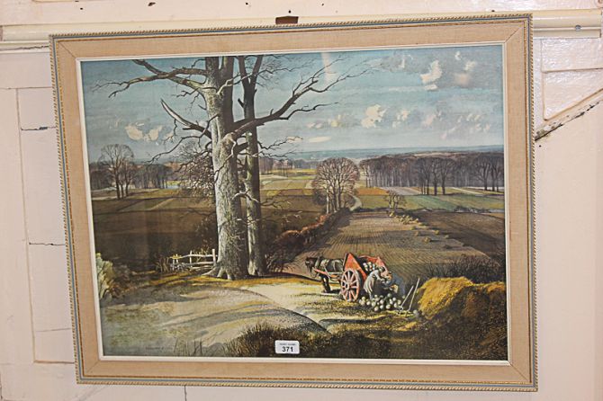 After Rowland Hilder, view across fields, figures beside a horse and cart in the foreground, 'Morning Sunshine', colour print, paper label verso, 48cm by 65cm
