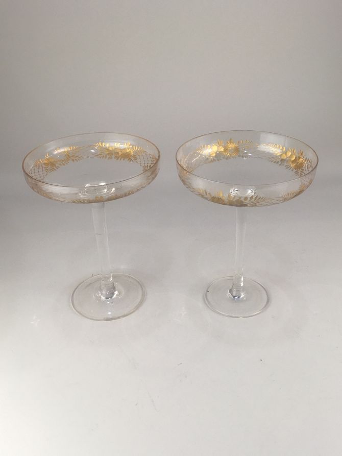 A near pair of glass bonbon dishes, each with shallow circular bowl on tall stem and circular foot, with gilt floral decoration, 17.5cm high