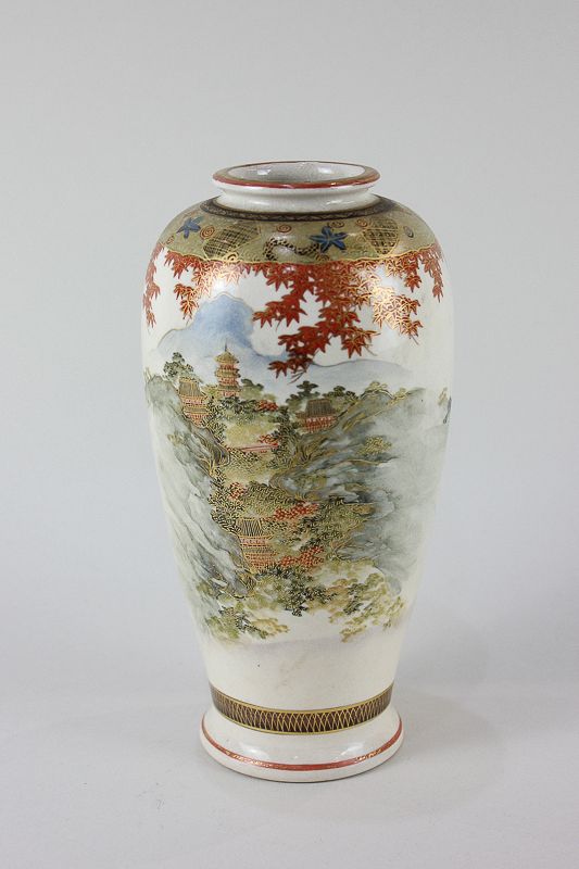 A Japanese Satsuma pottery vase, decorated with a scene of pagodas in a valley amongst trees, character marks to base, 19cm high
