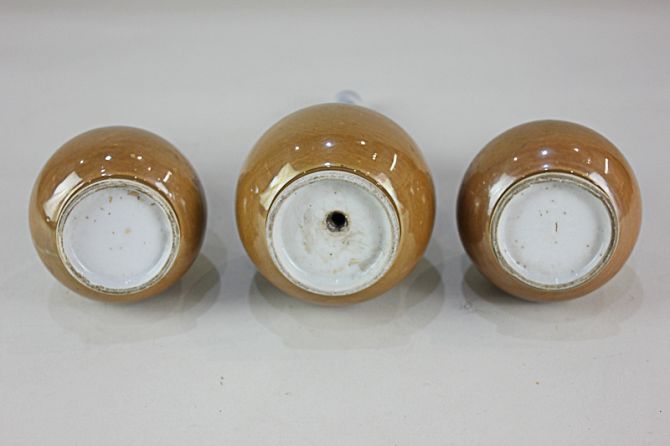 A set of three Chinese porcelain blue and white bottle vases, depicting flowers, vases and other items, and brown border base, (a/f) tallest 20cm