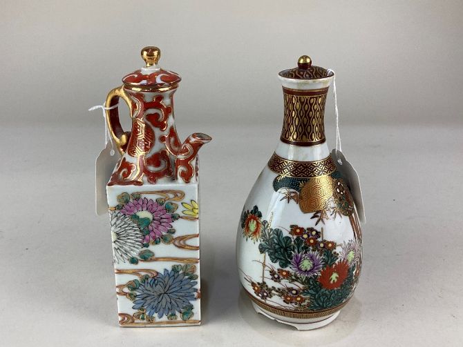 A Japanese porcelain bottle vase and cover, decorated with birds and flowers, with gilt embellishments, character marks to base, 15.5cm high, together with a Japanese porcelain jug and cover, decorated with chrysanthemum, and swirling gilt design, 17cm