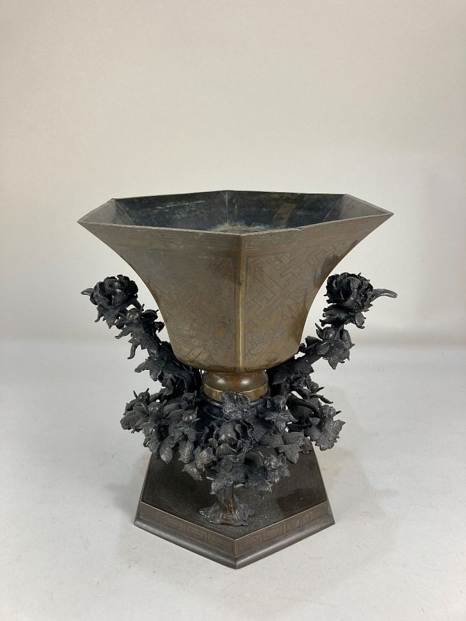 A Japanese bronze table centrepiece, the hexagonal vase inlaid with designs of butterflies and flowers, the base ornately case with foliage design, 29cm high