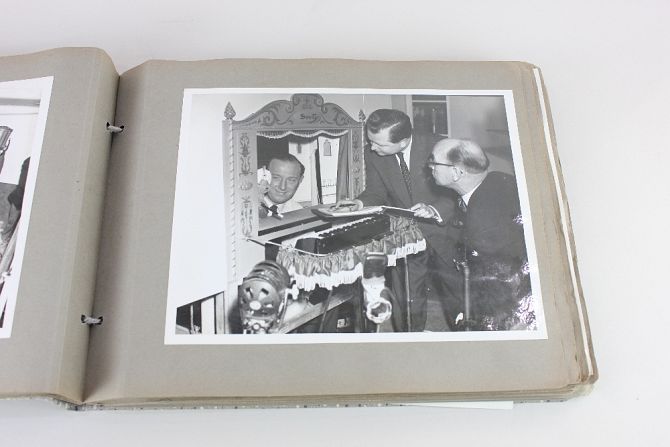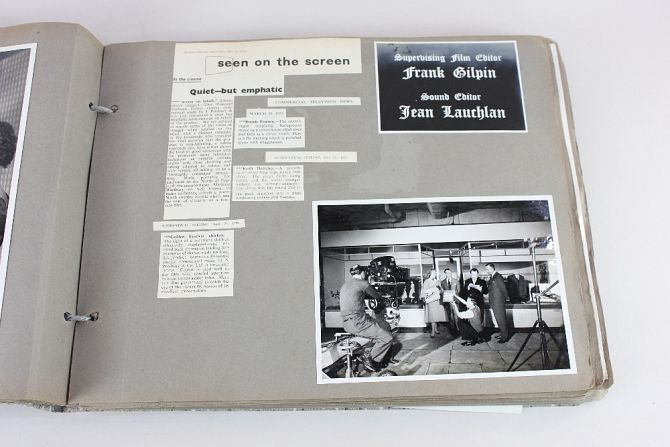Film memorabilia; a late 1950s / early 1960s scrapbook containing black and white photographs, studio shots, newspaper and magazine cuttings of the life and work of director Frank Gilpin (1923-1981), to include scenes from 1950s Sooty films, and scenes from the filming of advertisements such as Quality Street and Kraft 'Miracle Whip' margarine