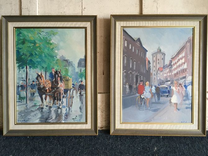 Johan Meyer Andersen (Danish, 20th century), a pair of street scenes, figures on bicycles, and a horse and cart, oil on canvas, signed, 39cm by 29cm