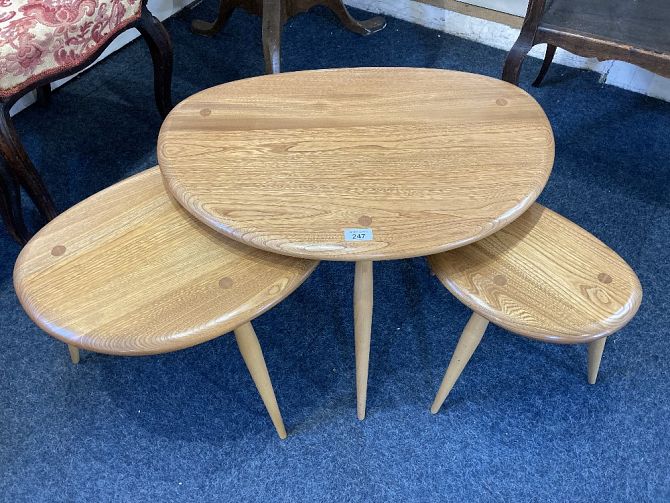 An Ercol nest of three pale wood 'pebble' tables, on cylindrical splayed legs, labelled, largest 64cm