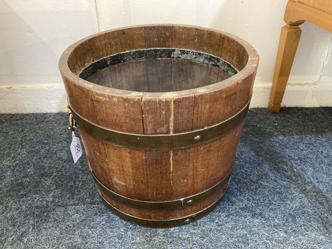 A coopered stick stand, with copper mounts and ring handles, makers label for R A Lister & Co Ltd, 31cm diameter