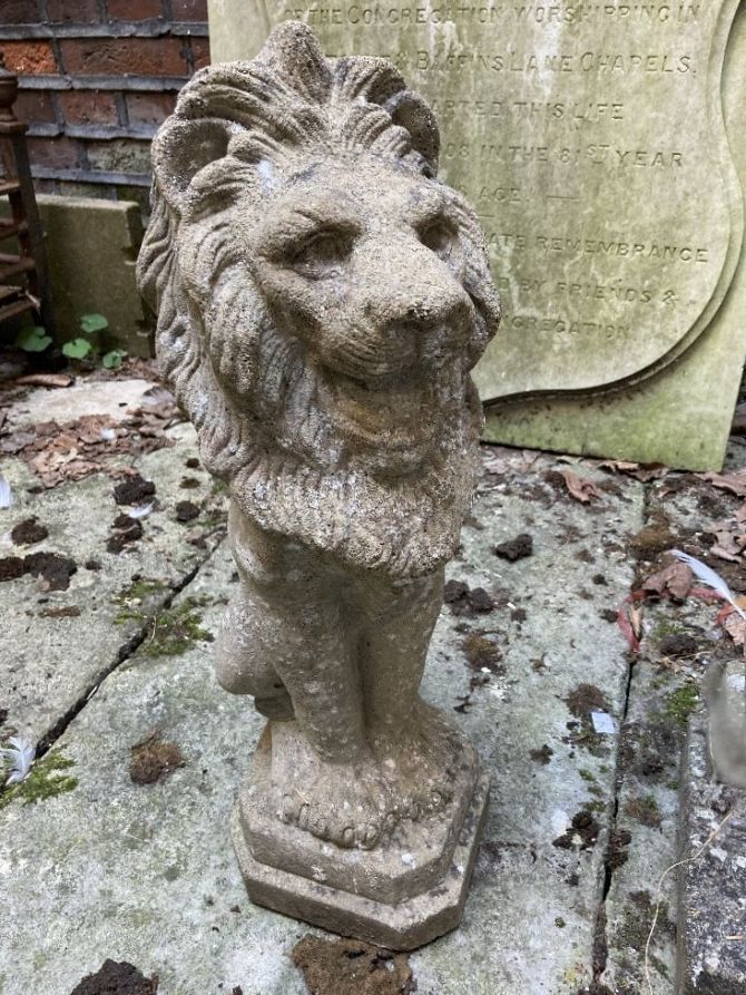 A composition stone garden statue of a seated lion, 57cm high
