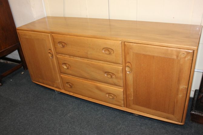 An Ercol 'Windsor model' pale wood sideboard, with three central drawers and cutlery tray flanked by two cupboards, raised on four castors, 155cm