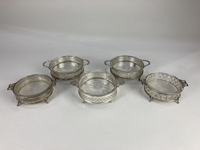 A near pair of George V silver and frosted glass dishes, makers Adie Brothers Ltd, Birmingham 1922, with different pierced designs, a near pair of similar dishes, maker Henry Matthews, Birmingham 1922, and another similar (5) (a/f - some glass liners chipped) 8oz