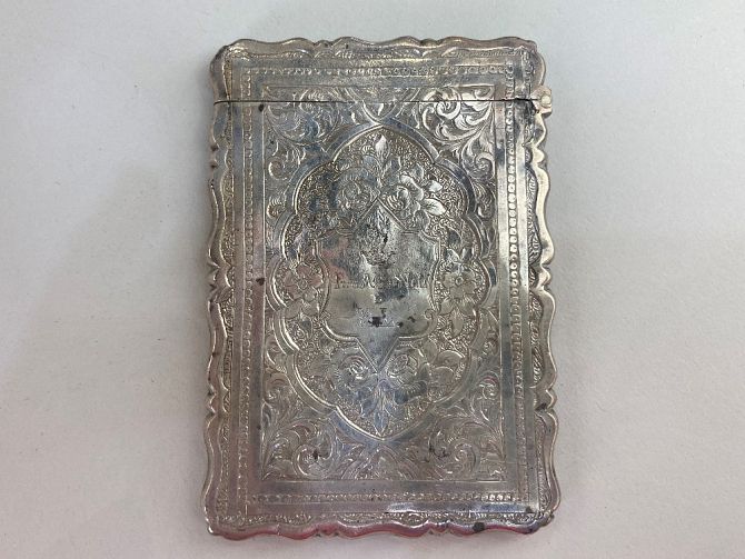 A Victorian silver card case, maker George Unite, Birmingham, 1875, with all over floral design and scalloped form, presented 'From AC and LL to ML with stag and crown crest, 1.6oz