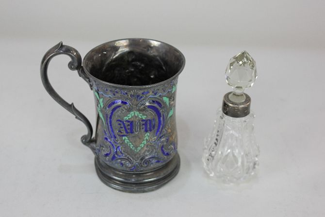 A Victorian silver and painted enamel christening mug, with embossed scene of a couple with child in a cot and opposing cartouche with engraved initials, variously painted with blues and green, maker Edward and John Barnard, London 1856, 6oz, 11.5cm and a mall cut glass scent bottle and stopper with sterling silver collar, 11.5cm high