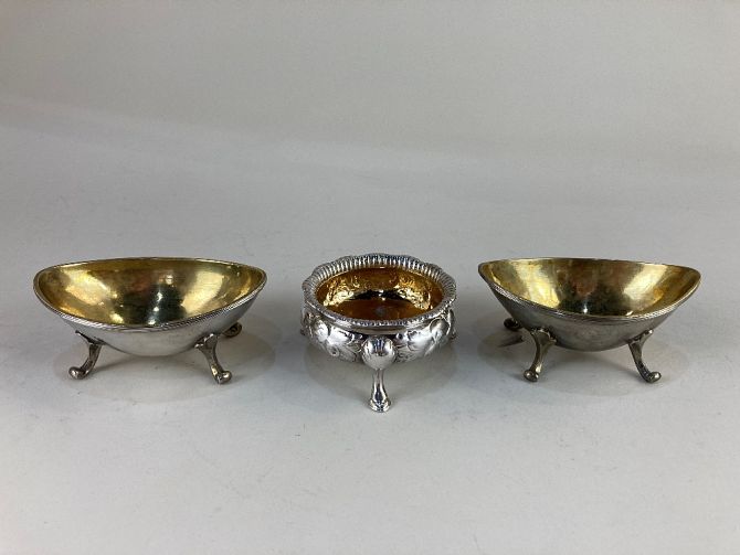A Victorian silver cauldron salt, maker William Robert Smily, London 1854, with gilt interior and embossed floral design, together with a pair of oval salts with gilt interiors
