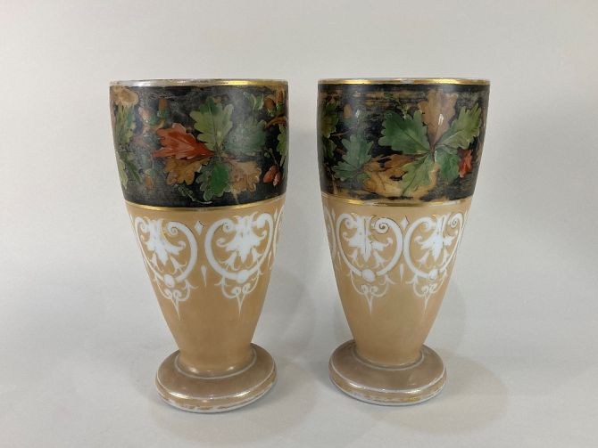 A pair of Victorian painted glass vases, with oak leaf and acorn design on black ground, above scrolling design on gold ground 30.5cm high