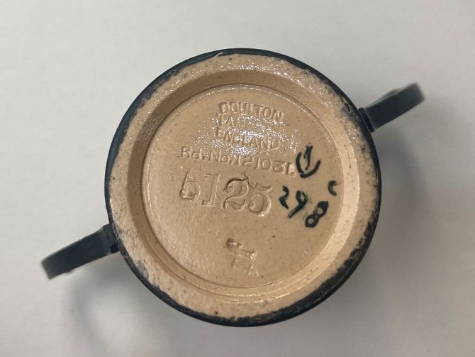 A Victorian silver gilt mounted Doulton Lambeth pottery cruet set, decorated in the Egyptian style with gilt raised relief on black ground, some pieces by Minnie Forster, others by possibly E Wakely, the silver gilt hallmarked Spurrier & Co, Birmingham 1895, 1896, 1897, with two matching salt spoons and two similar mustard spoons
