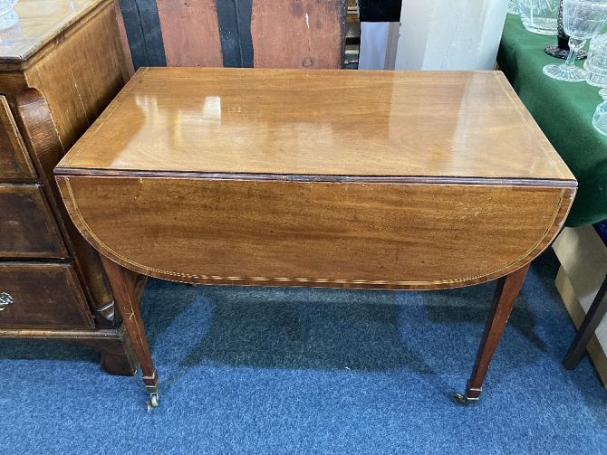 A 19th century inlaid mahogany Pembroke table oval top with crossbanded and line inlaid border, single end drawer on square tapered legs and castors, 91cm