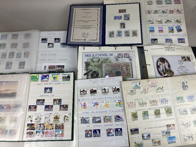 Two albums of coin first day covers, The Millennium and The Royal Family, five albums of Elizabeth II mint stamps, and The Queen Mother Great Britain Mint Collection