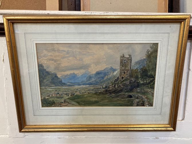 Arthur Bright (19th century), mountainous Swiss landscape, ruin in the foreground, watercolour, inscribed, signed and dated 1871, 21cm by 36cm