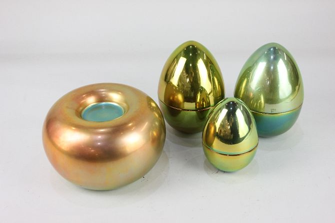 An Eva Zeisel for Zsolnay gold / green iridescent candle holder, of bulbous form, 11cm high, together with three Zsolnay gold coloured egg shaped pots, largest 15cm high