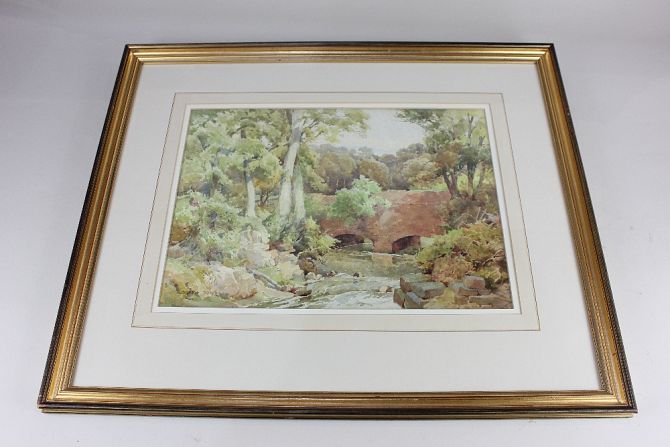 Joseph Powell (early 20th century), river landscape view of a bridge amongst trees, watercolour, signed, paper label verso for J Morton Lee, 27cm by 38cm
