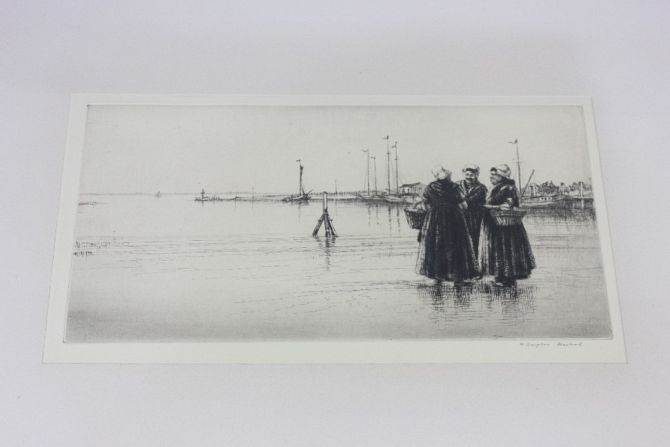 William Douglas Macleod, three women gathered on a shoreline, distant harbour, 'Weston Scheldt, Holland', etching, signed in pencil, verso printed paper label, 16cm by 30cm'