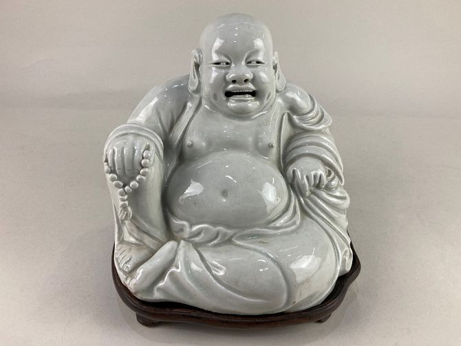 A Chinese pottery seated laughing Buddha on hardwood stand, paper label with character marks, 19cm high including stand