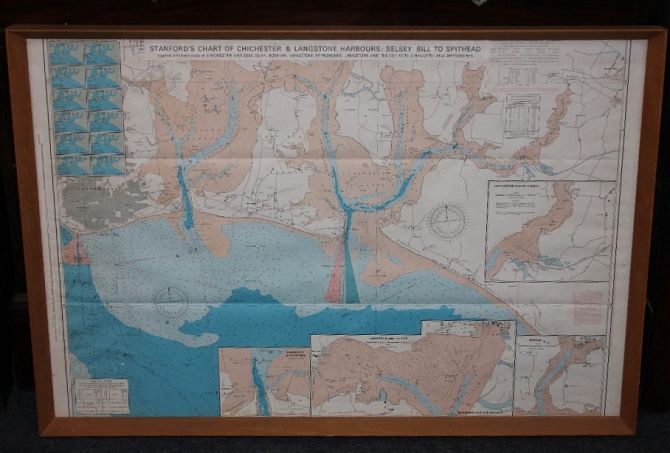 A framed Stanford's Chart of Chichester and Langstone Harbours: Selsey Bill to Spithead together with inset charts of Chichester and Dell Quay, Bosham, Langstone Approaches, Langstone and The Cut with Emsworth and Approaches, 66cm by 98cm