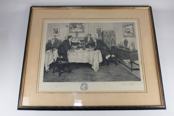 James Dobie after Walter Dendy Sadler, interior scene with gentlemen drinking port, monochrome print, signed in pencil by Sadler and Dobie, 41cm by 52cm