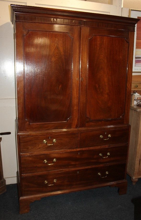 A George III mahogany linen press cupboard, with panelled doors enclosing four sliding shelves, over two short and two long drawers, with brass drop handles, on bracket feet 126cm