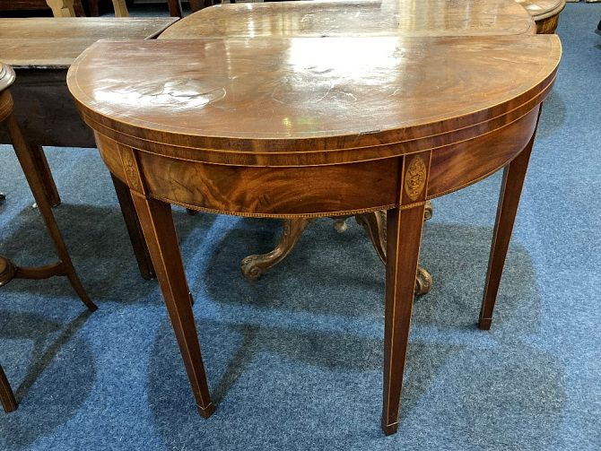 An Edwardian Sheraton style mahogany demi lune card table crossbanded foldover top with green baise lining, inlaid line edges and saw tooth patterned border on square tapered legs with inlaid oval panels and spade feet, (a/f) 92.5cm